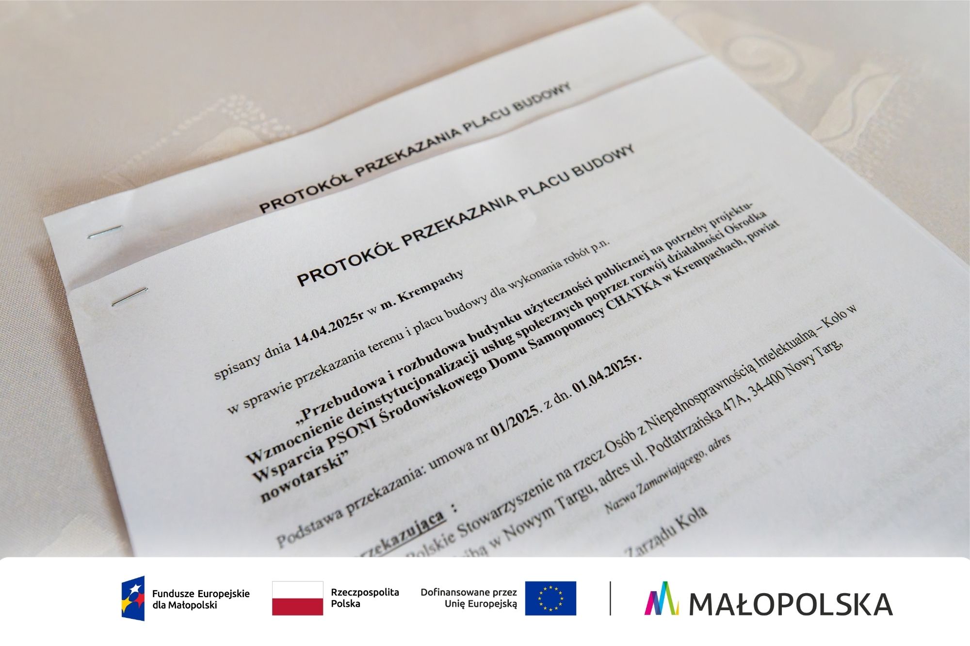 Z radością informujemy, że w dniu 1 kwietnia 2024 roku została podpisana umowa z Wykonawcą na realizację prac remontowych w budynku w Krempachach, w ramach projektu pn. „Wzmocnienie deinstytucjonalizacji usług społecznych poprzez rozwój działalności ośrodka wsparcia PSONI, Środowiskowego Domu Samopomocy CHATKA w Krempachach – powiat nowotarski”, który realizowany jest przez PSONI – Koło w Nowym Targu w ramach Priorytetu 5 Funduszy Europejskich dla Małopolski 2021–2027.