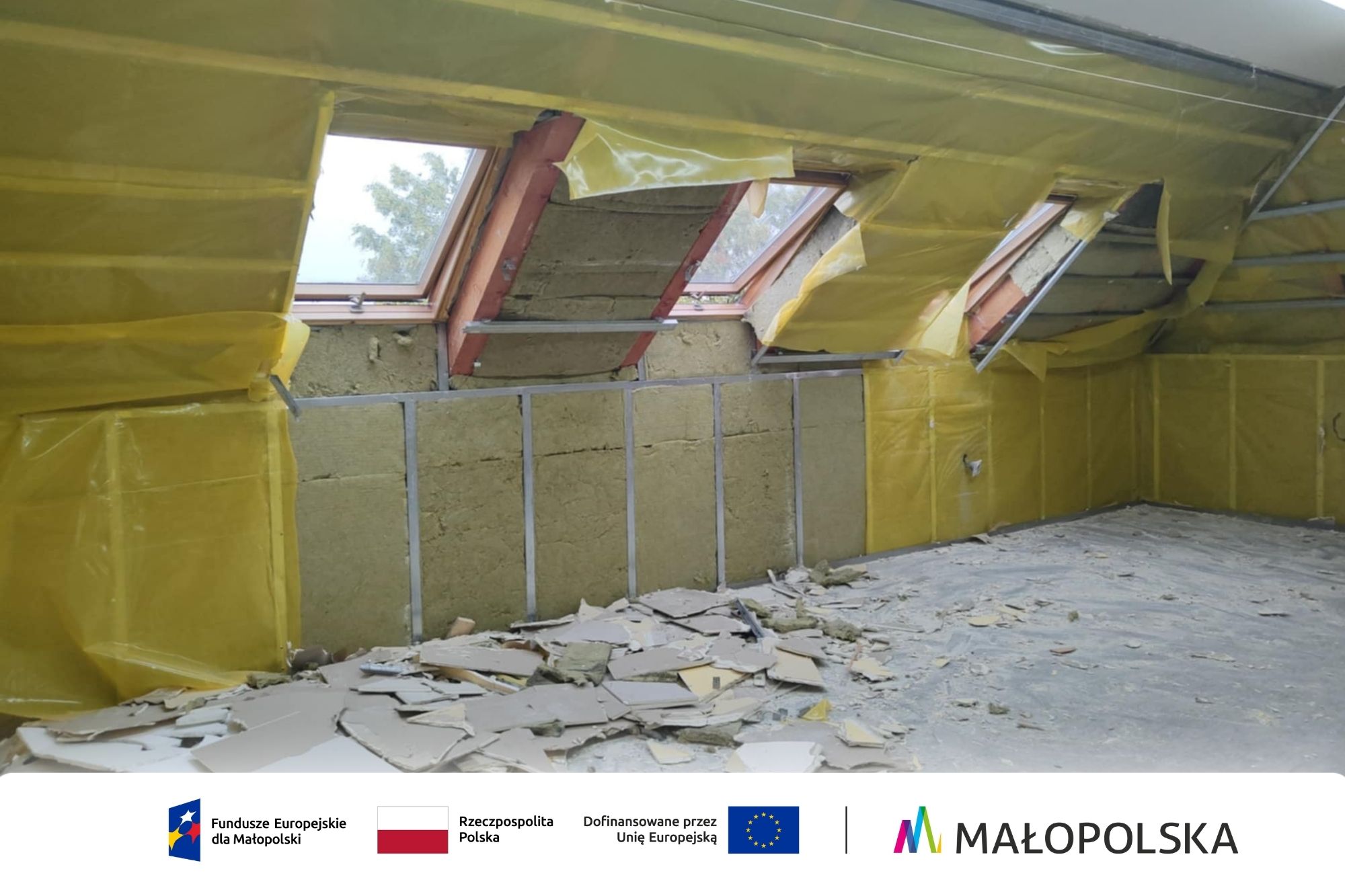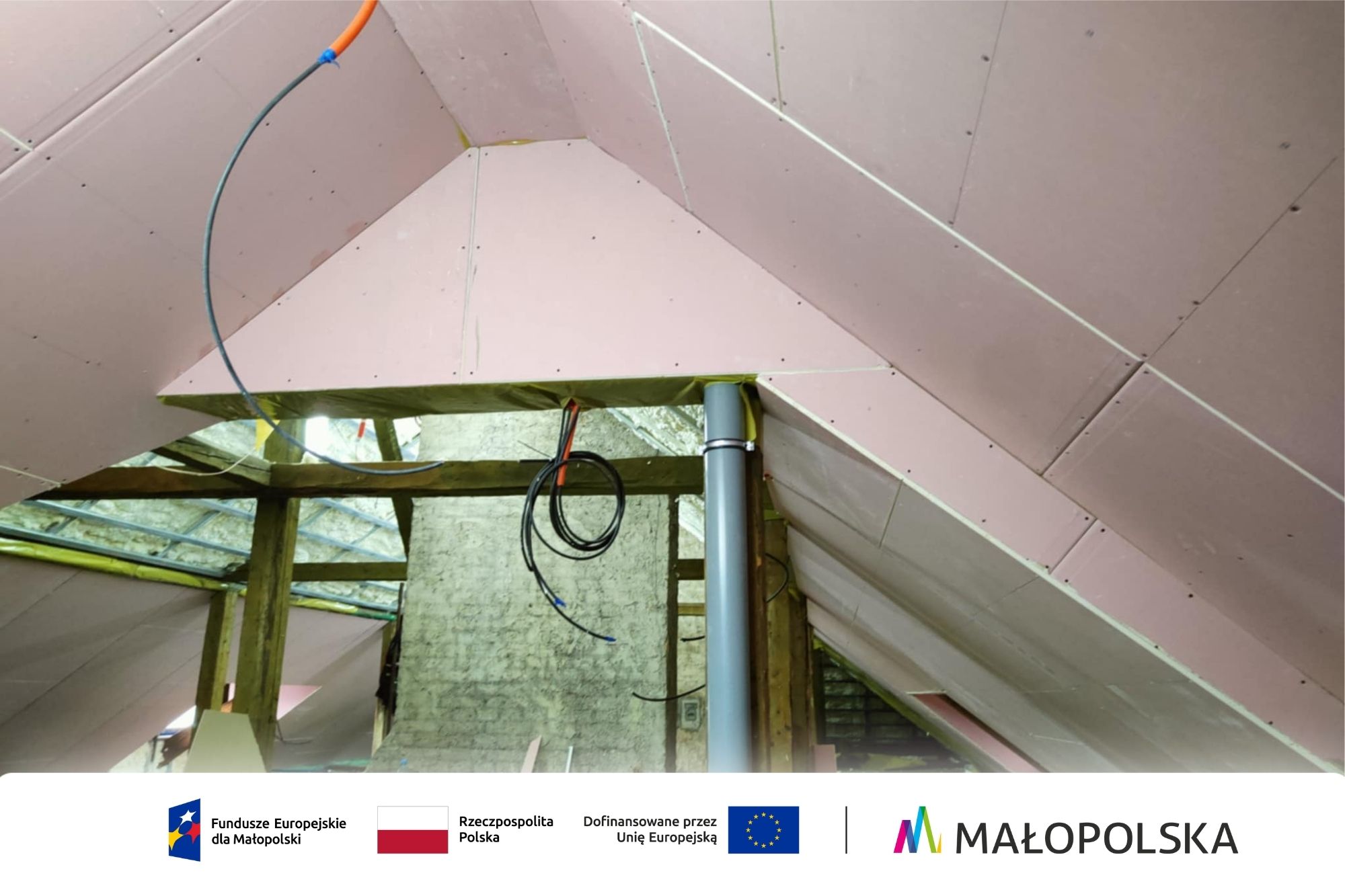 Równolegle prowadzone są prace wodno-kanalizacyjne oraz sanitarne. Trwa także ocieplanie ścian wewnętrznych budynku – to element kompleksowej termomodernizacji, która nie tylko poprawi komfort cieplny, ale również zwiększy efektywność energetyczną obiektu.