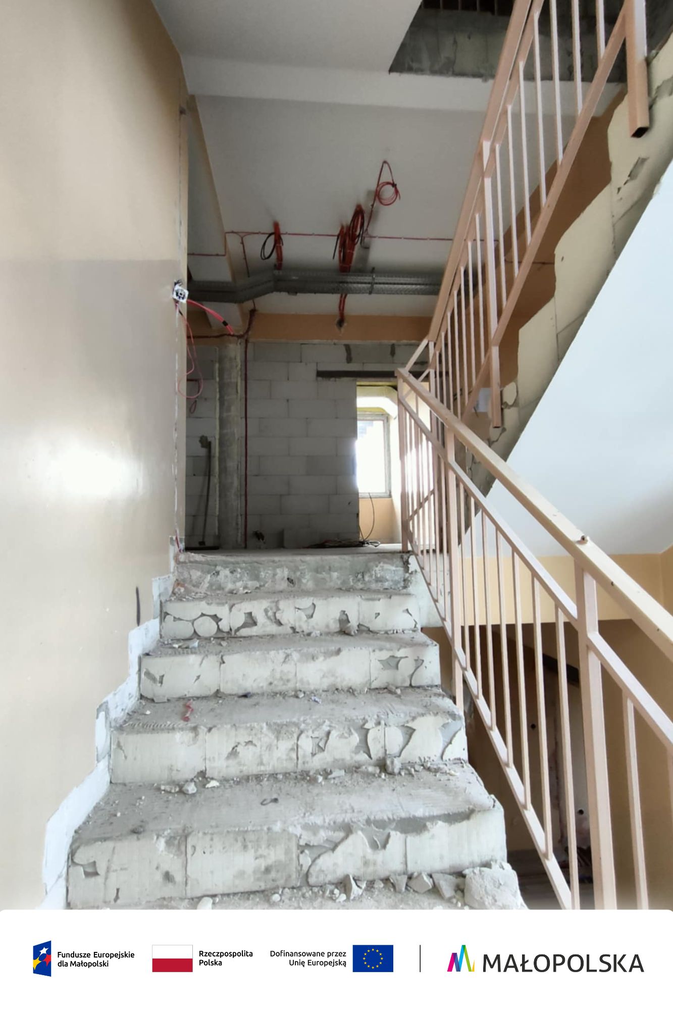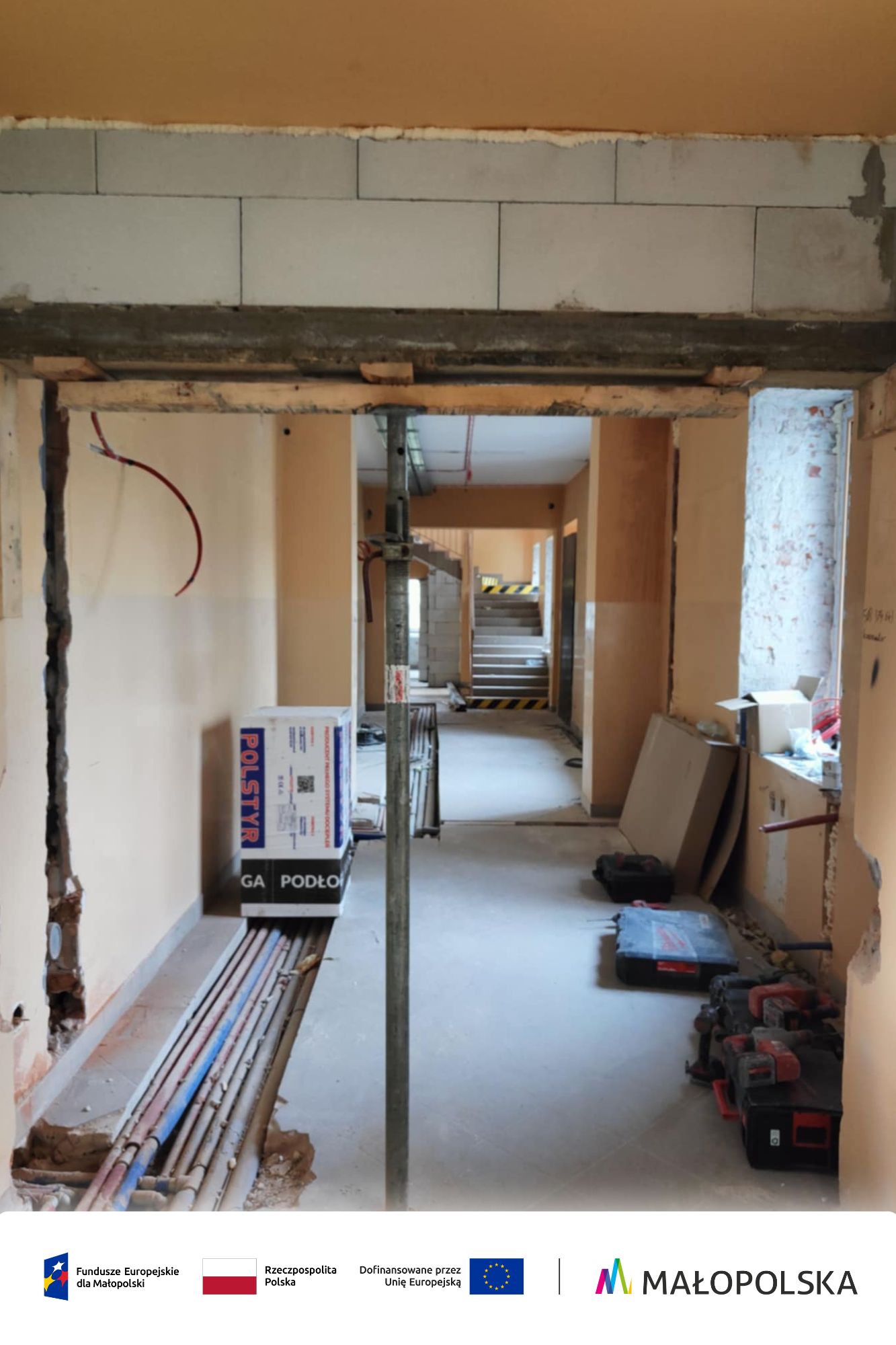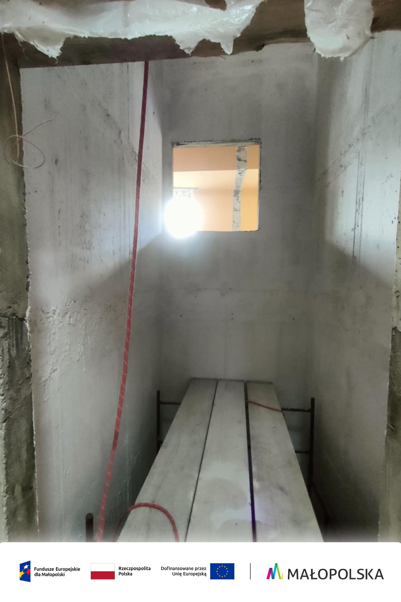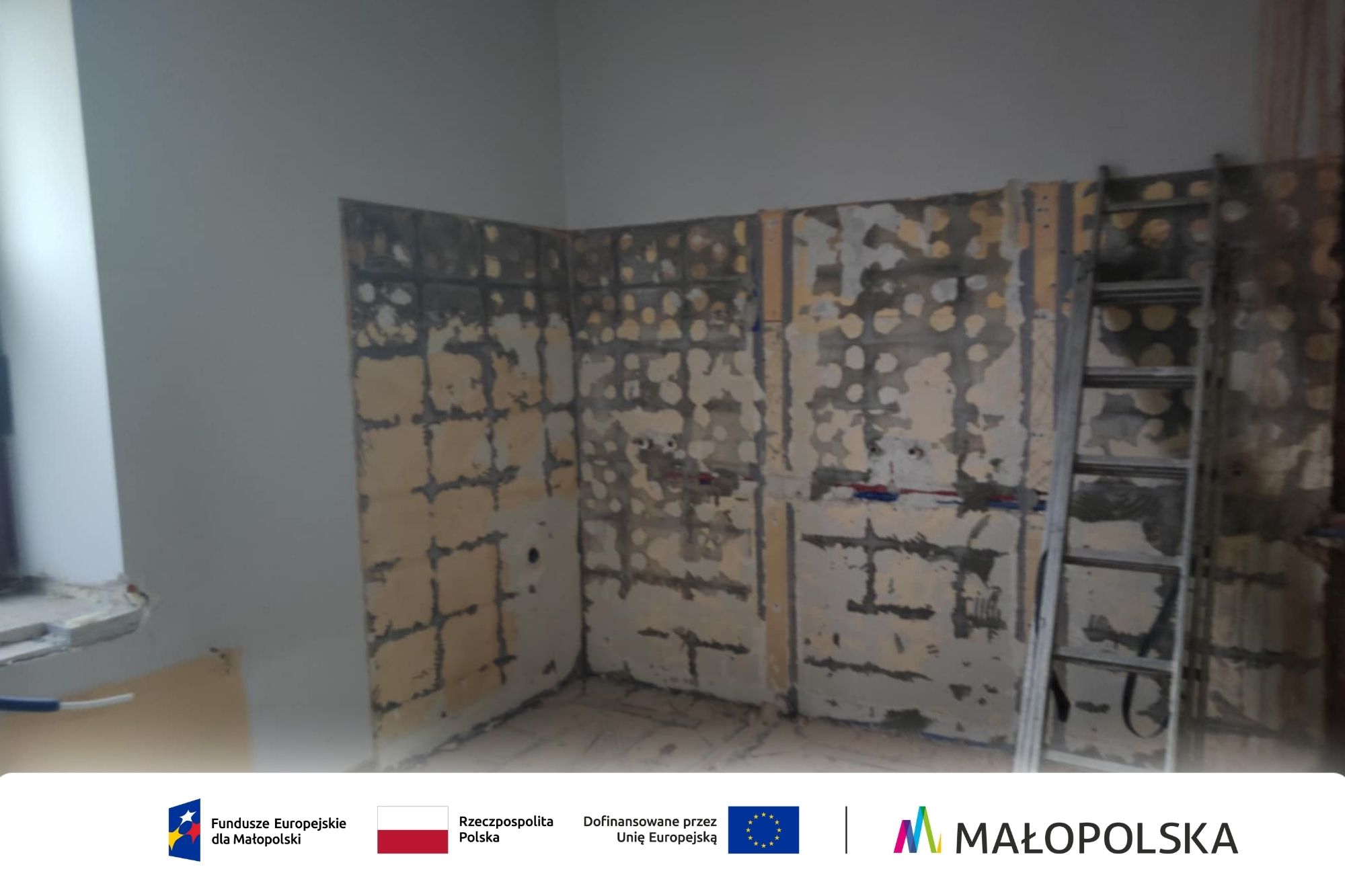 W budynku został wykonany szyb windowy – to ważny krok na drodze do zapewnienia pełnej dostępności dla osób z ograniczoną mobilnością. Przeprowadzono również niezbędne wyburzenia ścian, dzięki czemu wnętrze zaczyna przybierać zupełnie nowy, bardziej funkcjonalny układ, dopasowany do codziennych potrzeb uczestników.