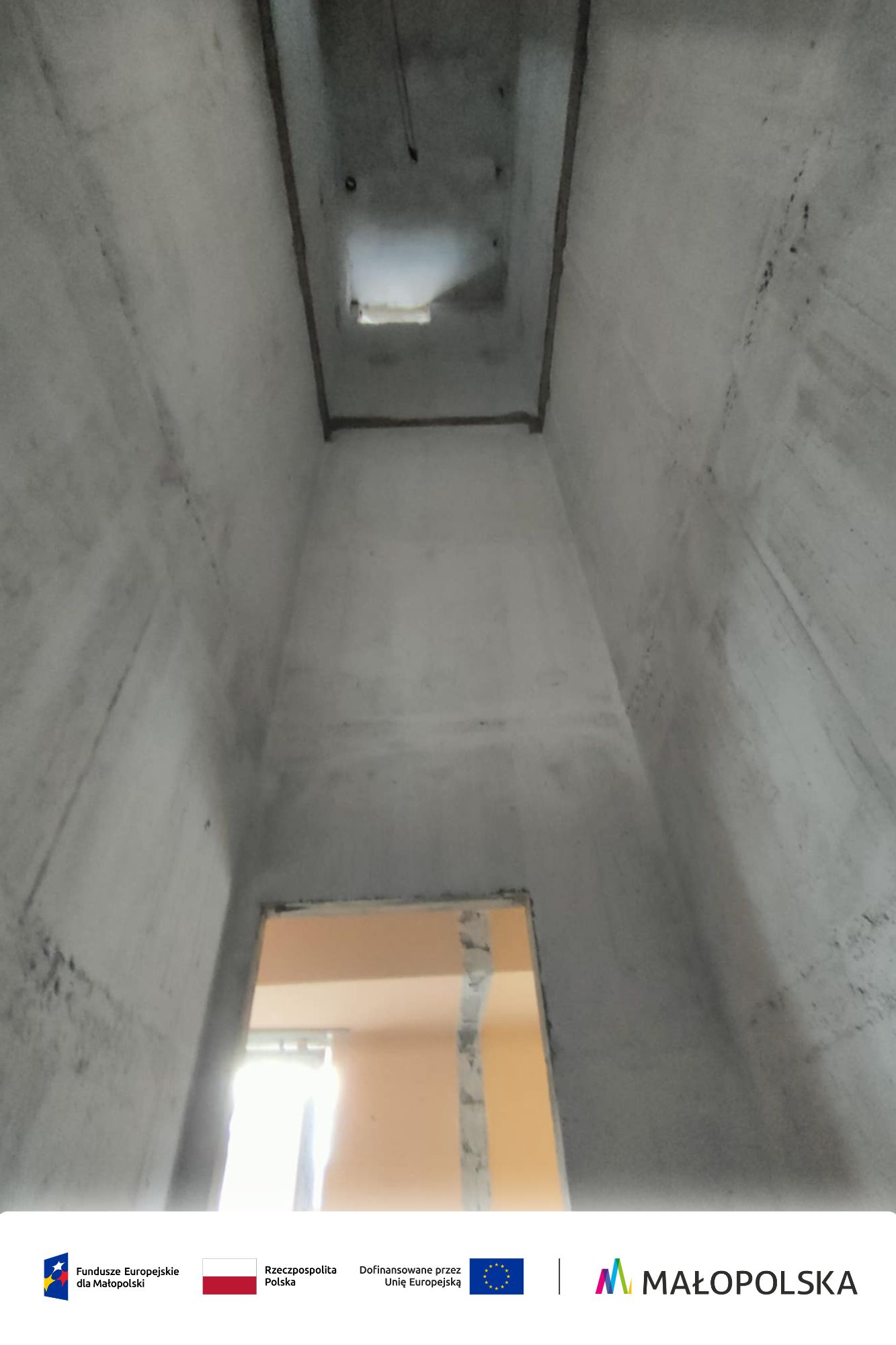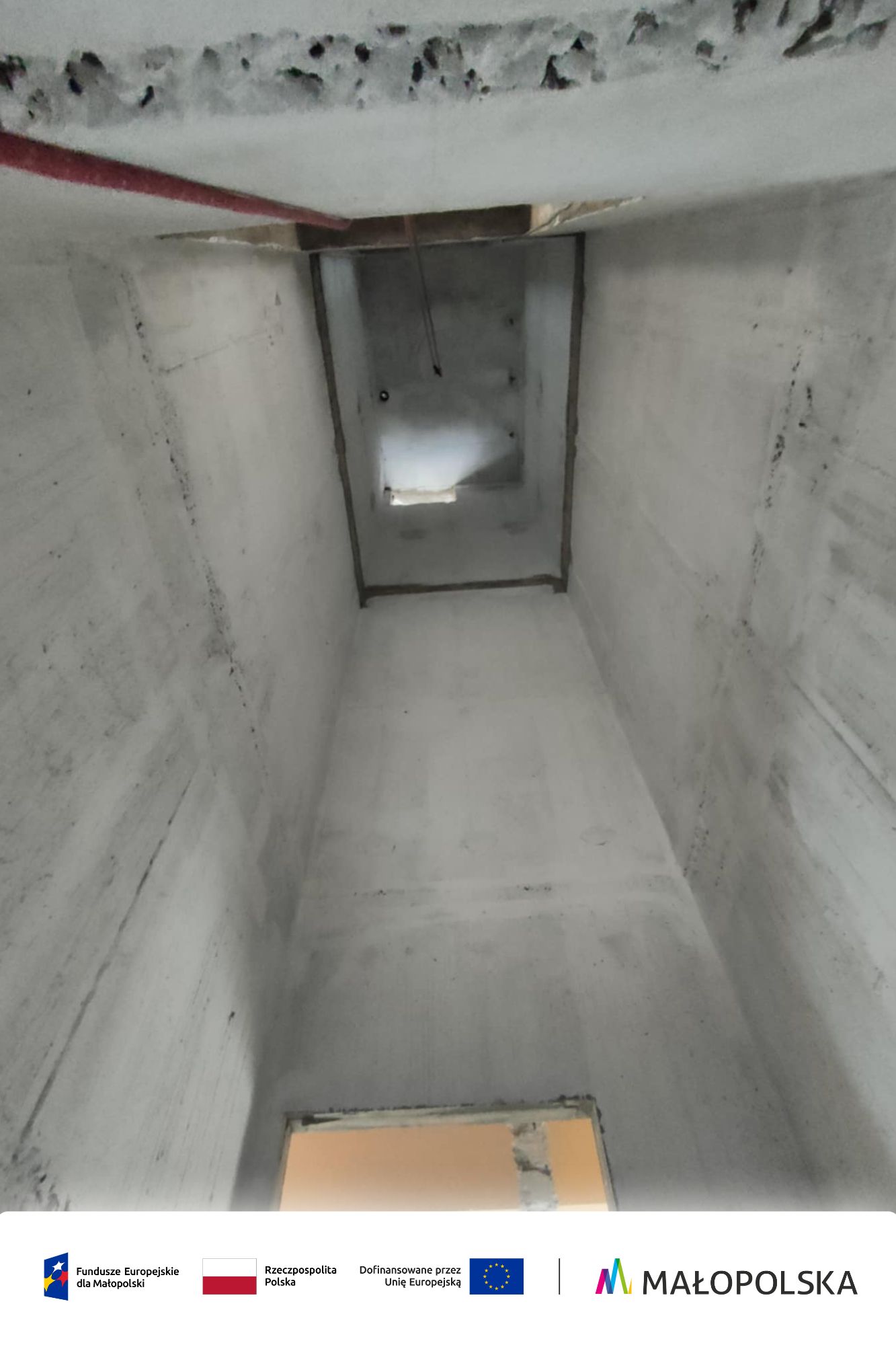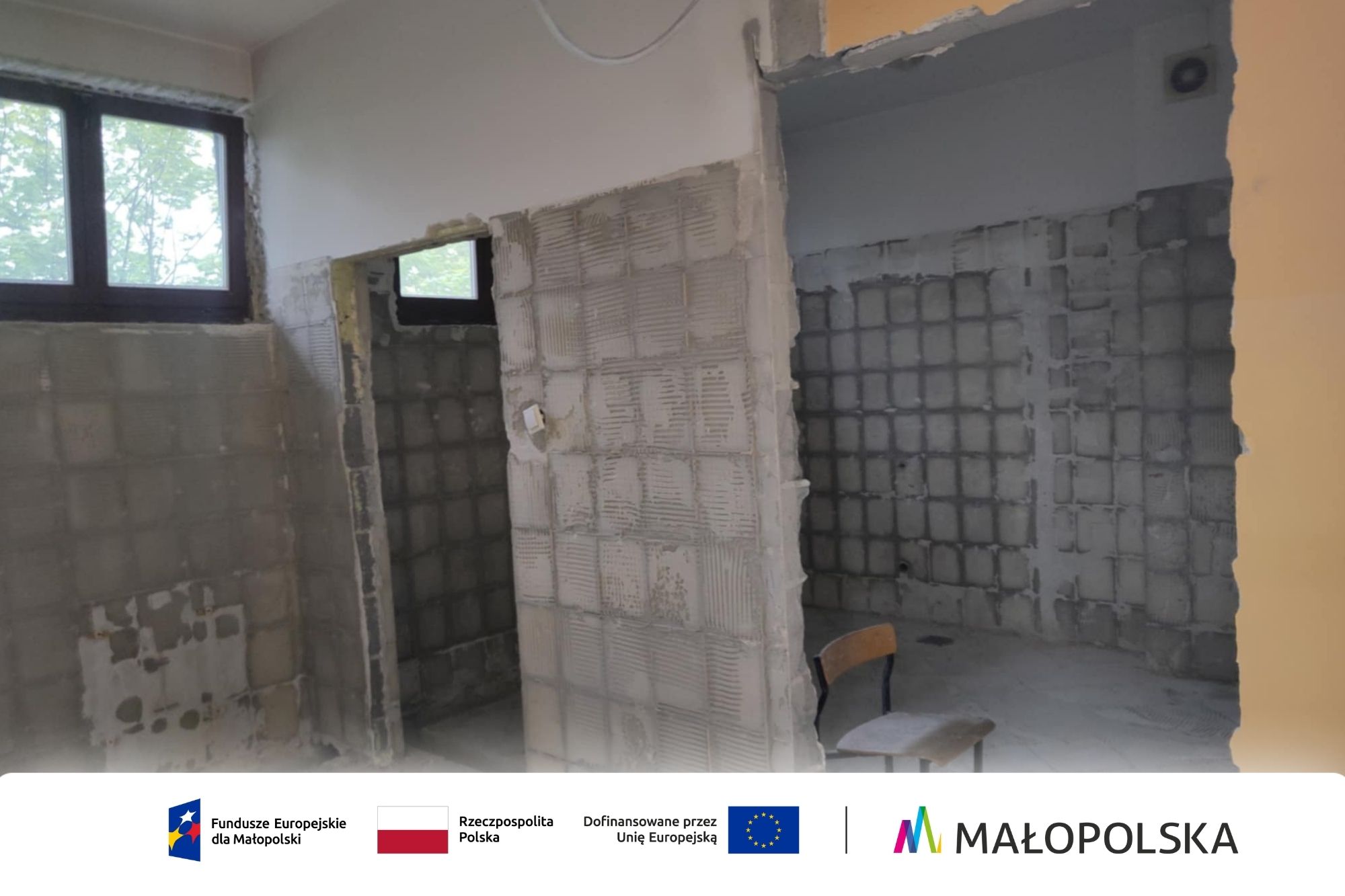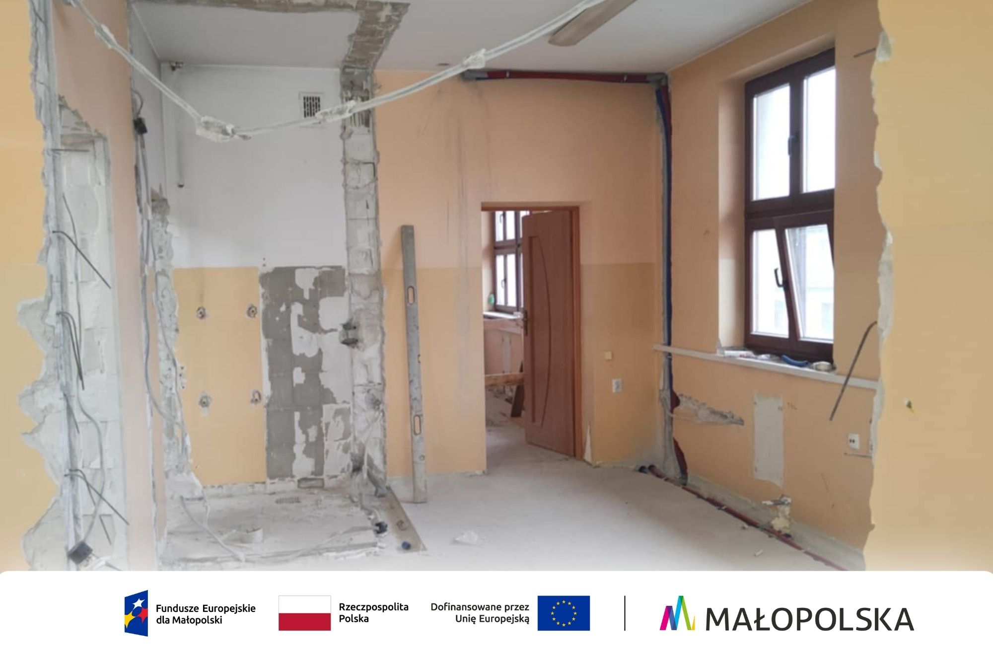 W budynku został wykonany szyb windowy – to ważny krok na drodze do zapewnienia pełnej dostępności dla osób z ograniczoną mobilnością. Przeprowadzono również niezbędne wyburzenia ścian, dzięki czemu wnętrze zaczyna przybierać zupełnie nowy, bardziej funkcjonalny układ, dopasowany do codziennych potrzeb uczestników.